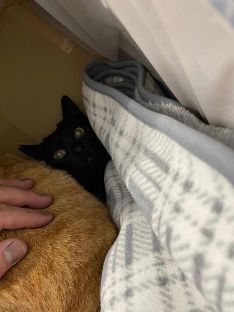 簡易的に設置したネコハウスから全く出てこようとせず、怯えてずっと重なり合って震えています。